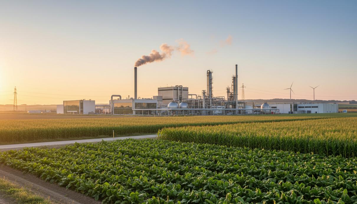 Современный биоперерабатывающий завод в Европе на фоне обширных сельскохозяйственных полей под утренним небом. Видны промышленные резервуары и трубопроводы.